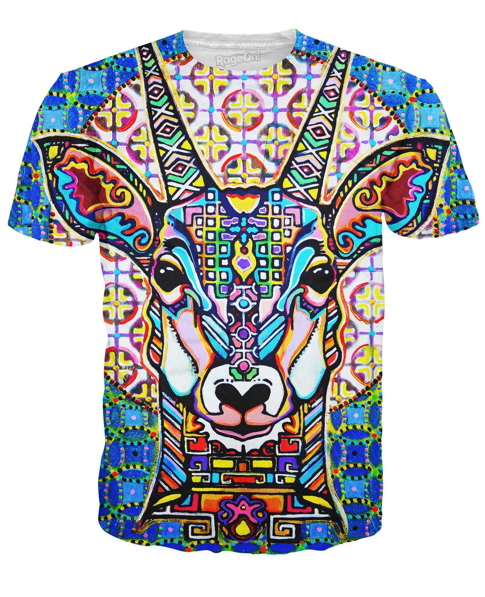 Check out this out this psychedelic Cosmoctolope T-Shirt from artist David Frank featuring vibrant colors, detailed cultural art, and a trippy antelope. This South American art all-over print tee is available now, so get your sexy shirt exclusively at RageOn!