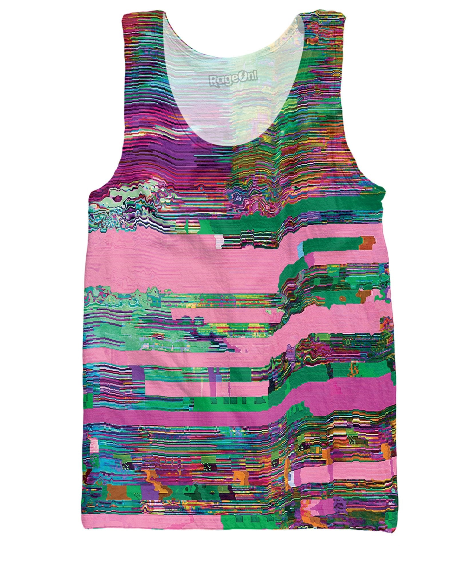 Relive the horror of old school tech glitches with this Glitch Tank Top from Let's Rage! This pink and green all-over print design is every tech nerd's nightmare and available now, only on Rage On!