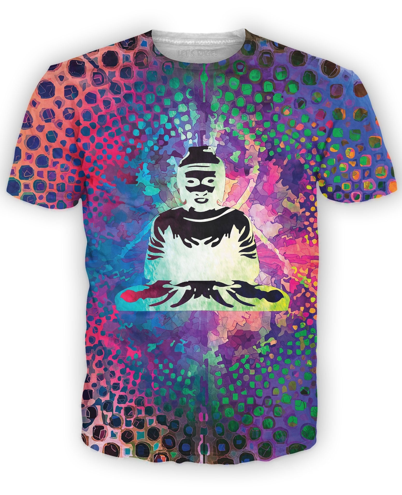 Get this Purple Buddha T-Shirt from Let's Rage! This all-over print design with fractal pinks and blues is available now.