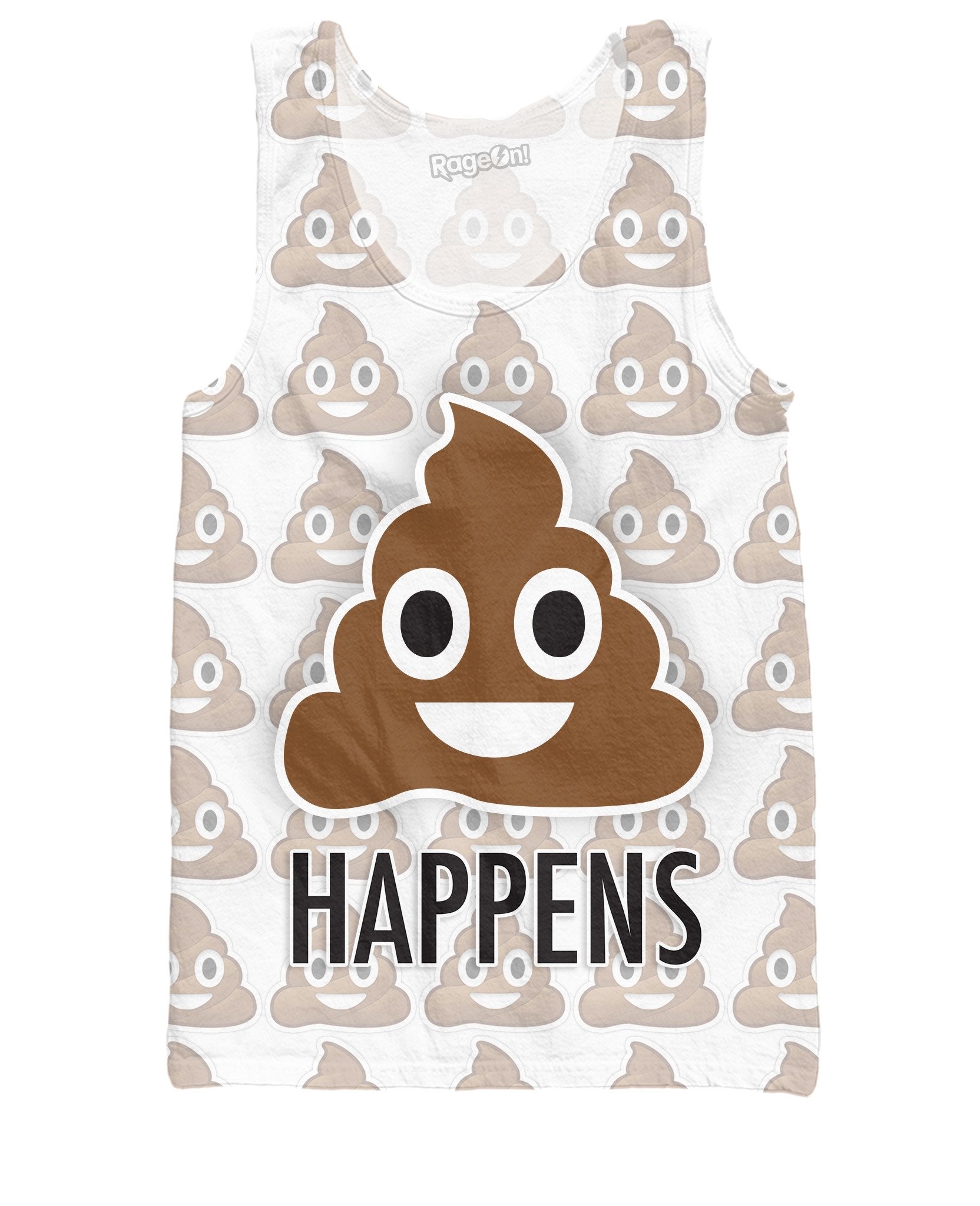 It happens, what shit? Sometimes in this all-over print Shit Happens Tank Top design! This sexy tank features a high-quality image of the famous poop emoji + text "Happens" = Shit Happens! Be ready for any shit that comes your way with this vibrant tank top design today.