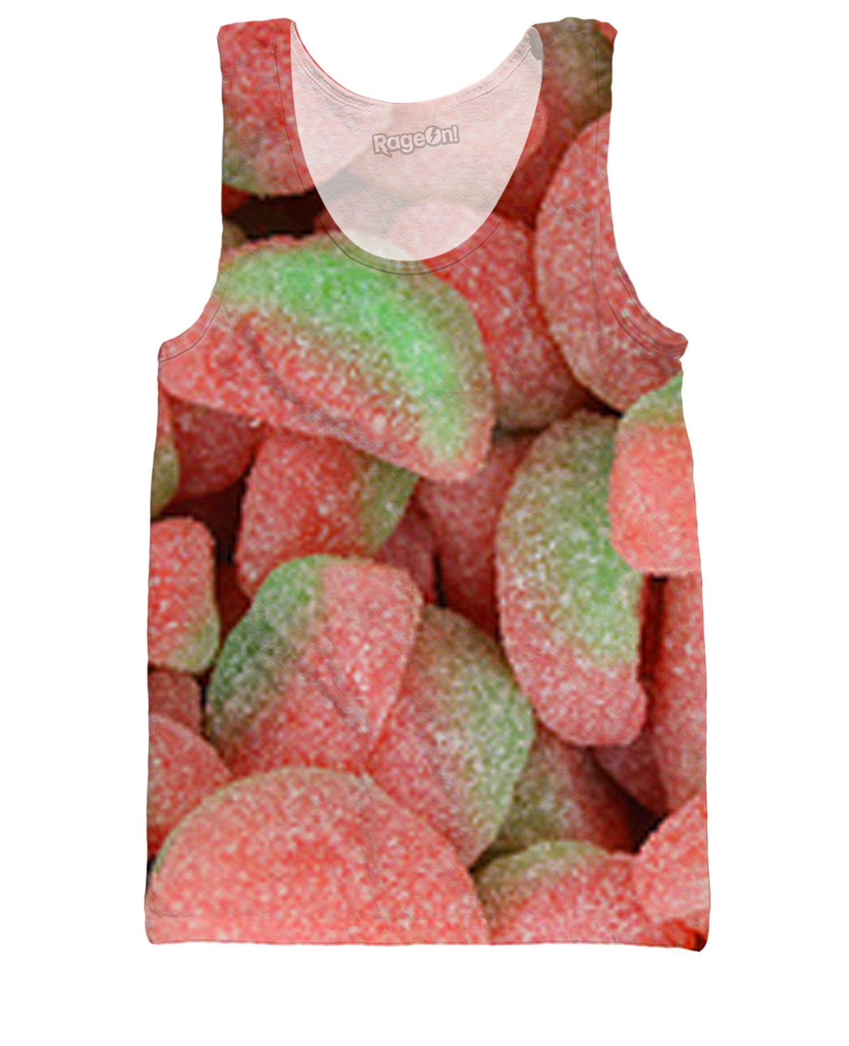 Chewy and succulent, these tender pink fruit jell candy slices always tingle your tongue with a tangy watermelon flavor! Get this all-over print Sour Watermelons Tank Top from Kan D. Shoppe now, exclusively on Rage On!