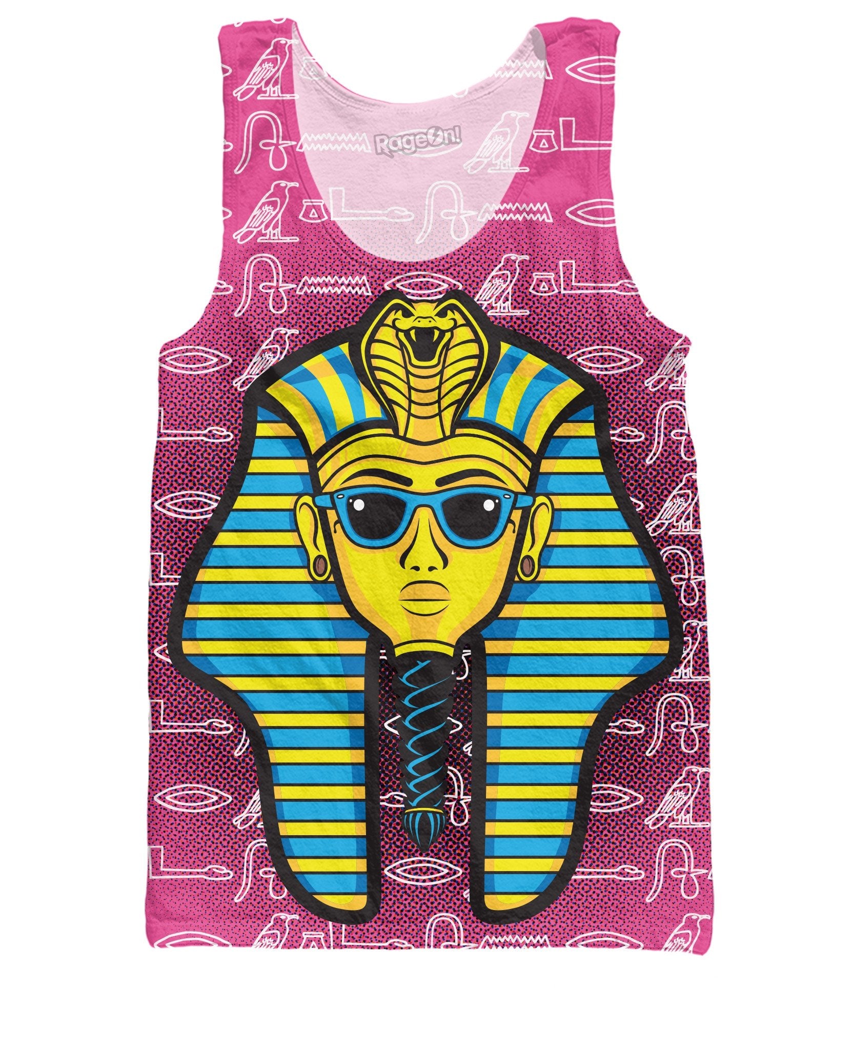 Get groovy this summer with this all-over print Sun Pharaoh Tank Top from our brand Let's Rage. This vibrant psychedelic tank features an Egyptian Pharaoh sporting some rocking sunglasses and surrounded by Egyptian hieroglyphics. Get this pop art inspired design today!