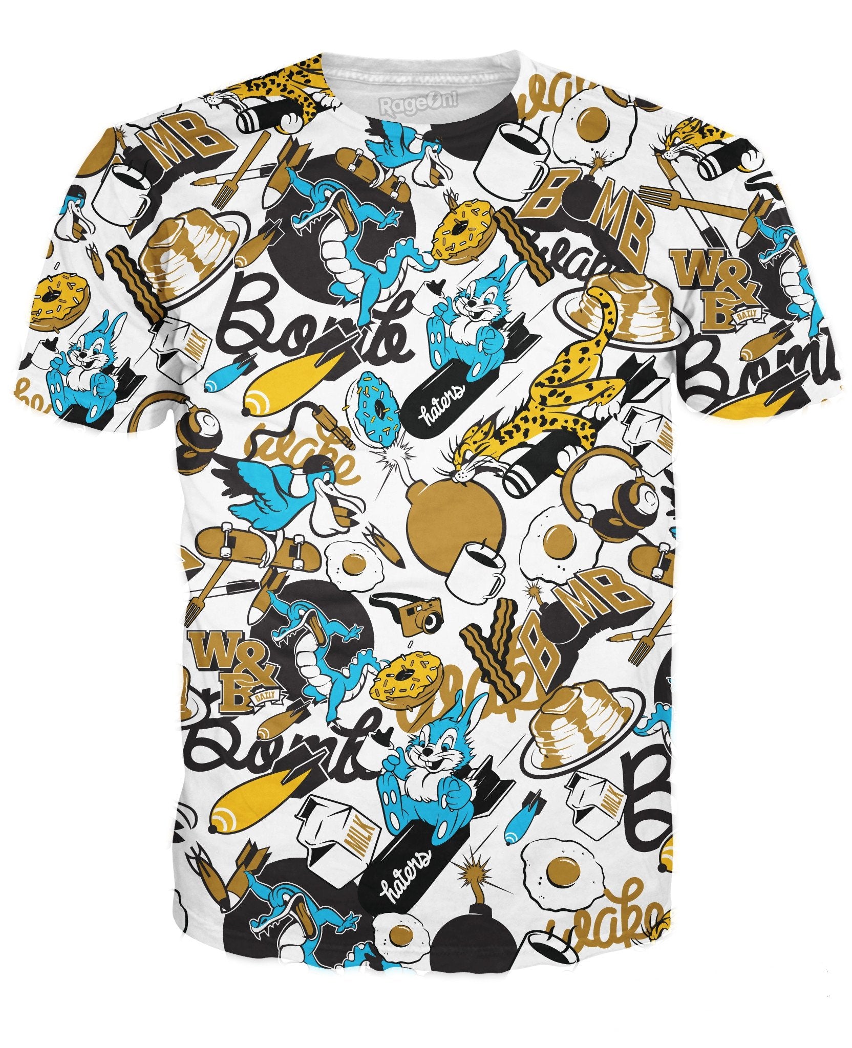Check out this sick Wake and Bomb T-Shirt by artist Matthew Kuntz! This all-over-print tee features illustrations of bombs, bacon, pancakes, alligators and much more! Get this vibrant fully sublimated design today.