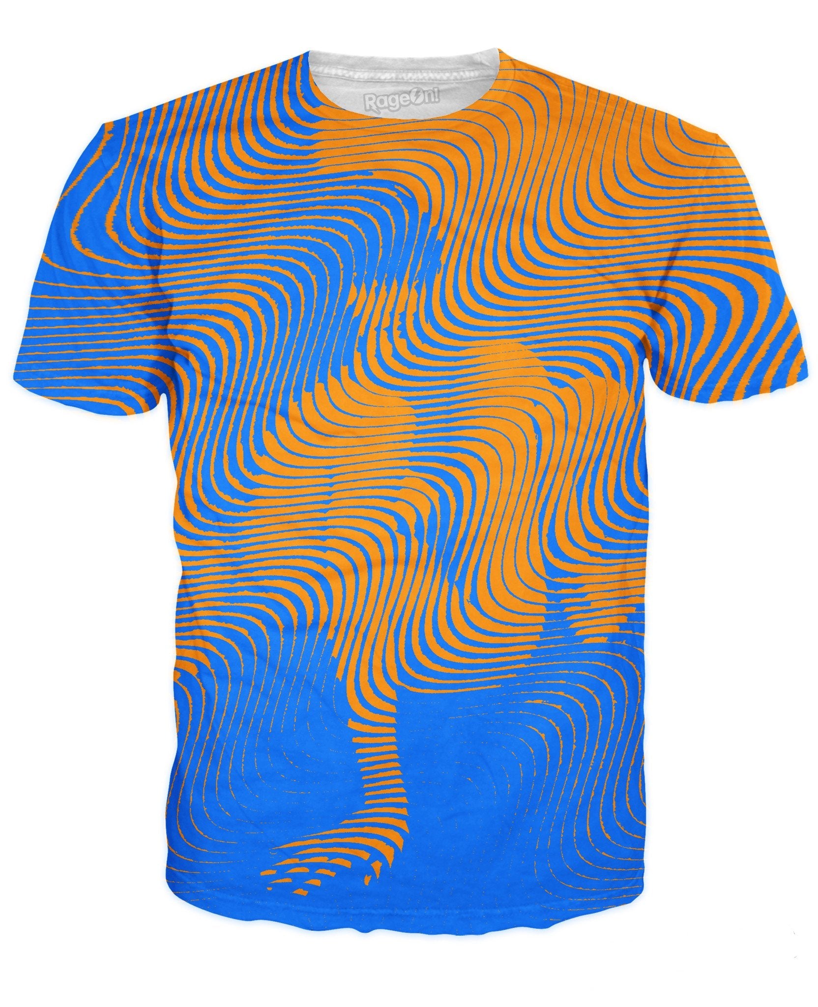 Check out this sick all-over print Wavy Wow T-Shirt from Larry Carlson! This trippy design uses complimentary colors, blue and orange to give the tee a funky, fresh look!